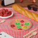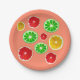 Padrão de fruta de citrinos em fatias brancas e coloridas, sobre fundo cor-de-rosa-salmão, com ilustrações de Sacha Grossel de limão, toranja cor-de-rosa e fatias de fruta limão, num padrão colorido de socos de fruta. Summery e brilhante, este é kitsch e suculento.