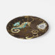 Fundo de madeira castanho com fundo marinho, cordilheira mecânica, volante antigo, âncora de ouro e diversas engrenagens de ouro e latão. Estilo Steampunk.