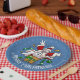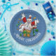 A funny snowman cartoon on paper plates for a Christmas party. Use "Personalize this template" to change the "Merry Christmas!" text and create a unique, customized item. It's maximum Christmas with this excited snowman dressed up as Santa Claus, jumping out of a Christmas present like a jack-in-the-box. The surprise gift is wrapped in gold paisley wrapping paper and a green ribbon with white snowflakes.