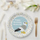 Criar suprimentos personalizados para festas de aniversário e outros eventos especiais. Estas placas de papel apresentam um estilo de desenho ilustrativo de uma gaivota, uma borda festiva de impressão de confetti e sua mensagem em letras brancas em negrito contra um fundo azul-claro.