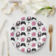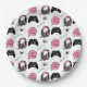 Placas de papel de festa de aniversário com temas para jogos com cor-de-rosa, cinzas e gráficos pretos, como fones de ouvido, controladoras e nível de texto para cima.
