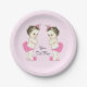 Adoráveis filhinhas gêmeas vestindo calças de rúfle e panfletos de coelhinho com placas de chá de fraldas gêmeas. Essas lindas placas de papel de chá de fraldas duplo podem ser personalizadas com texto no estilo de fonte e na cor de sua escolha, e você pode escolher sua própria cor de fundo.