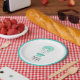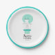 Chapas de papel super bonitas apresentam uma girafa em um balão de ar quente azul-aqua e amarelo listrado e seus detalhes em letras quicas. Também disponível em PINK. CORRESPONDENDO a itens na nossa loja.