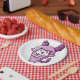 Um gato feliz em um cone de sorvete com o sorvete na cabeça, o sorvete é de cor de morango e há um floco de chocolate saindo do sorvete. Por martinspixs.