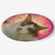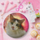 Retrato de um bonitinho e adorável gato calico com olhos verdes, nariz rosa e pele multicolorida e lisa. O belo animal de estimação parece hetero em seus olhos. Uma pintura digital de uma fotografia. Um prato de papel elegante e engraçado para qualquer um. Personalizável. Você pode mudar a imagem. Você pode usar a imagem de seu próprio gato em vez da imagem de modelo, se quiser. Você pode transferir este design para uma variedade de outros produtos de sua escolha. Use o botão "Editar Design" ou "Personalizar" (conforme o caso) para ajustar a imagem à forma do produto específico. Ele o transferirá para a Ferramenta Designer. Use a opção "Ajustado/Preenchimento" (menu do lado direito da Ferramenta Designer). Você pode dimensionar, girar, sacudir a imagem no modelo do produto e pode adicionar algum texto próprio a ela. Seja criativo, comprar, divirta-se e seja feliz!
