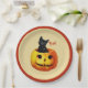 Conjunto de placas de papel, cada uma com uma imagem vintage do Dia das Bruxas mostrando um gato muito bonito sentado numa abóbora de um design Ellen Clapsaddle.