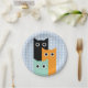 Placas de papel adoráveis com três gatos engraçados. Um é preto, à esquerda do design, outro é laranja, ligeiramente inferior e à direita do gato preto, ligeiramente à sua frente e outro é lacrado, inferior aos outros dois gatos e parado à sua frente. A única característica nos gatos é grande olhos redondos. O fundo das placas é um padrão de gingham azul pastel bonito.