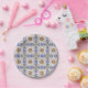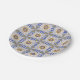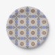 A round paper plate is shown from two angles, featuring a detailed geometric pattern with blue, yellow, and white colors. The design includes star-like shapes and intricate mosaic-like motifs, conveying a traditional and artistic feel. The first image shows the front view, and the second shows a side angle.