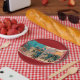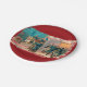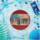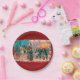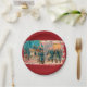 Uma placa de papel vintage americana patriótica mostrando George Washington assumindo o comando do seu Exército no início da Guerra Revolucionária e então dizendo adeus às suas tropas à direita no final da guerra.