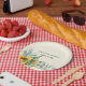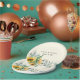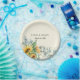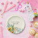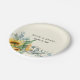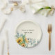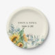 Girassol aquarelado rústico e elegante e eucalipto em pratos de papel amarelo claro.