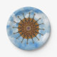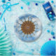 Um círculo kaleidoscopic de violinos de sobreposição assemelha-se a um girassol e é indicado contra um céu azul vívido com as nuvens brancas macias.