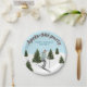 Celebrate a birthday on the slopes with these ski-themed paper plates, designed by Destei. The design features a watercolor illustration of a girl skiing down snowy slopes, wearing a teal jacket with a brown hat and gloves, surrounded by green fir trees under a light blue winter sky with falling snow. The plates can be personalized with text, making them a festive and fun addition to a winter birthday party.