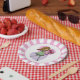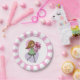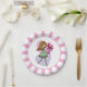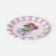 Fun pink and white party plates featuring a cute whimsical girl with long flowing yellow hair and wearing a green dress and stripped stockings. She is holding a beautiful bunch of red roses in her outstretched arms. The background is made up of a pink and purple love heart.