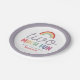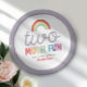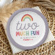 Celebrate turning two with this adorable “Two Much Fun” birthday paper plate! Featuring a modern retro rainbow, colorful font and space to add your child’s name on the front, plus a coordinating purple outline. Perfect for a 2nd birthday party.