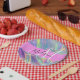 Nome do monograma holográfico iridescente e pratos de papel iniciais. Seu nome personalizado e monograma são escritos em um elegante roteiro escrito à mão com um fundo rosa. Um aniversário perfeito ou presente de Natal!