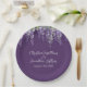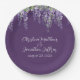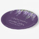 Esses pratos de casamento florais românticos apresentam um roxo escuro com flores de glicínias em aquarela. Uma delicada videira de glicínias e folhagens é retratada na parte superior.