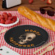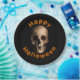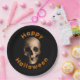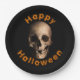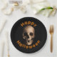 Grande crânio desgastado em placa preta com "Feliz Dia das Bruxas" laranja ao redor do crânio.