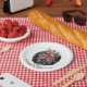 A symmetrical floral design featuring four large red roses arranged in a square pattern against a dark black background. Each rose is detailed with multiple layers of petals, creating a deep crimson color with subtle gradients. The roses are positioned at the top and bottom corners of the frame, with each rose having its own set of green leaves and stems. The leaves are detailed with visible veins and a lighter green color. The roses cast subtle shadows on the black background, creating depth. The black background has a textured, slightly mottled appearance, giving it a rich, deep quality. The overall composition creates a balanced, decorative frame with the roses evenly distributed across the top and bottom of the image. The artwork has a vintage or classic illustration style with clean lines and detailed botanical elements.