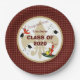 Tempere acima sua festa de formatura de Cajun com estas placas de papel personalizadas que caracterizam um lagostim que lanç um chapéu da graduação e um lagostim em um pirogue que joga o saxofone no fundo da flor de lis em um vermelho do marrom do divertimento e em um design do ouro.