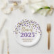 Classe de festa de formatura personalizável de 2025 pratos em um padrão glamouroso de ouro e confete roxo e elegante texto de estilo manuscrito.