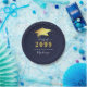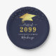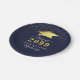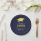 Chapas de papel personalizadas, personalizadas e elegantes, em festa de formatura azul marinho, com boné de formatura de folha de ouro metálico falso, confete de ouro, tipografia de escrita de caligrafia e ano de aula com PARABÉNS e seu nome de formando. Altere a cor de fundo para uma cor de escola ou para uma cor de tema do partido coordenador no EDIT. ASSISTÊNCIA: Para obter ajuda sobre modificação/personalização do design, alteração de cor, redimensionamento, transferência do design para outro produto ou sobre como coordenar itens, entre em contato com o designer ANTES DE PEDIR por meio do Zazzle Chat ou makeitaboutyoustore@gmail.com.