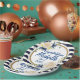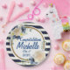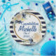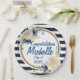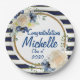 Comemore sua graduação com elegância e classifique-a com estes azuis marinhos lindos, branco, e placa de papel do ouro. Caracteriza um azul marinho profundo impressionante com listras fundo do branco, acentuado com arranjos florais azuis e brancos impressionantes. Personalizado a o que partido o detalhe você precisa.