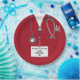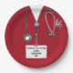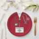 Chapas de festa de formatura de médicos criativos, com escovas vermelhas hospitalares, estetoscópio e canivete suíço. Para personalizar o texto de edição para adicionar o nome do médico.