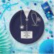 Placas de festa de formatura de escolas médicas criativas com esfregões de hospital marinho, estetoscópio e canivete suíço. Para personalizar o texto de edição para adicionar o nome do médico.