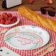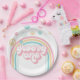 Groovy One Retro arco-íris inspirou as primeiras placas de aniversário com fontes e cores do estilo 70.