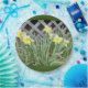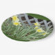 Uma Placa de Papel de 9 polegadas, com uma Imagem de um Grupo de Daffodils, sobre ela, um Fundo Verde escuro.