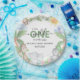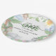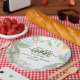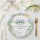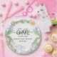 Pratos de papel para chá de bebê com ilustrações de aquarela de um macaco, papagaio, rinoceronte e girafa sentados em um fundo verde de selva. Os estilos de fonte, tamanho e cor podem ser alterados clicando no link personalizar ainda mais após a personalização.