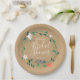 Um design moderno de prato de papel com uma guirlanda floral de flores da primavera emoldurando texto em script branco sobre um fundo kraft rústico. Ideal para o seu chá de noiva especial. Desenhado por Thisisnotme