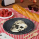Sirva seus convidados de festa nesta placa de papel do crânio floral gótico que inclui um crânio branco acentuado com lindas rosas brancas sobre um fundo texturizado a preto. Perfeito para o seu Festa de Halloween ou eventos temáticos góticos.