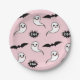 Placa de papel rosa e preto do Halloween com fundo de rosa claro, fantasma Kawaii fofo, texto BOO e morcegos pretos.