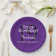 Placa de papel personalizável é mostrada com Feliz Aniversário, o nome da pessoa, a idade e um desejo especial "Que seja um ano excelente!" Projetado por HAMbyWhiteGlove conhecido como HAMbWG - Copos, guardanapos e outros itens são vendidos separadamente. Mostrado em roxo.