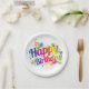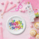 A bright and cheerful “Happy Birthday” plate bursting with color and celebration. The bold rainbow‑gradient lettering takes center stage, surrounded by playful balloons, stars, and swirling streamers in vibrant reds, blues, yellows, and greens. The crisp white background keeps everything clean and festive, making it an easy match for any party theme. Perfect for birthdays of all ages and a fun way to add instant joy to the table.