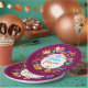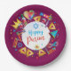 Happy Purim - Paper Plate. Translation from Hebrew: Happy Purim! Purim Jewish Holiday poster with stars of David, traditional Hamantaschen cookies, gragger toy - noisemaker, balloons, musicians, masks, Purim basket on festive confetti background. Wish a great Purim celebration. Carnival, Masquerade, Festival, Kids Party, Israel. Crafts & Party Supplies > Party Supplies > Tableware > Paper & Party Plates