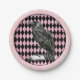 Esta prata de papel rosa e preto do Halloween apresenta um design de damasco cor-de-rosa vitoriano ao redor da borda, com um padrão de harlequin preto e rosa no centro, com um corvo preto sentado em uma perca.