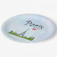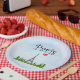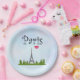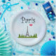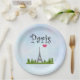 Chapas de papel com um desenho cômico da Torre Eiffel no fundo cercado por árvores verdes. Um coração cor-de-rosa e a tipografia de Paris adicionam um talento feminino.