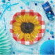 Girassol amarelo com centro em forma de coração e joaninha na xadrez vermelha e branca de búfalo.