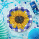 Girassol amarelo com centro em forma de coração e joaninha na xadrez azul e branca de búfalo.