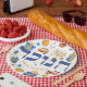 Estes pratos coloridos são a forma perfeita de fazer uma mesa festiva (sem preocupações) do Partido Chanucá/Chanukah. Aprecie seus convidados... Incrivelmente coloridos elementos Chanukah — incluindo Rosquinhas de gelatina, Dreidels, Presentes Molhados, Moedas Douradas e Estrelas — rodeiam a palavra CHANUKAH em hebraico. Se quiser ver uma versão diferente desta mensagem de design ou envie um e-mail para: bestdressedbread@gmail.com. Feliz Chanukah!