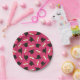 Graduation party paper plates printed with a hot pink pattern of graduation caps and diplomas with a yellow ribbon.