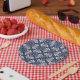 Geometric flower design in white and blue