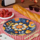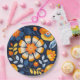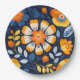Esta impressionante ilustração floral apresenta flores de tamanho excessivo e inspiradas retroativamente em tons de laranja, amarelo, azul e creme contra um fundo escuro. As flores estilizadas e semelhantes a desenhos animados criam um design lúdico, mas ousado