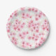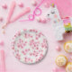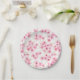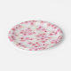 Este prato de papel é mostrado em uma linda impressão de flores cor-de-rosa.