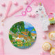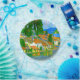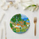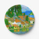 Paper plates in an impressionist style landscape of a small Mediterranean village with terracotta roofs and white walls, reflected in the water, and backed by mountains