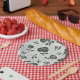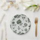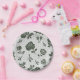 Round plate with intricate dark floral patterns on a light background. The design has roses and leaves with a subtle honeycomb texture, viewed from top and angled sides.