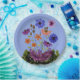 Criação digital de pratos florais coloridos para reuniões.