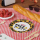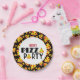 Chapas de festa de aniversário com formato de pizza de criança divertida com um fundo com padrão de pizza, e texto editável para adicionar seu próprio nome